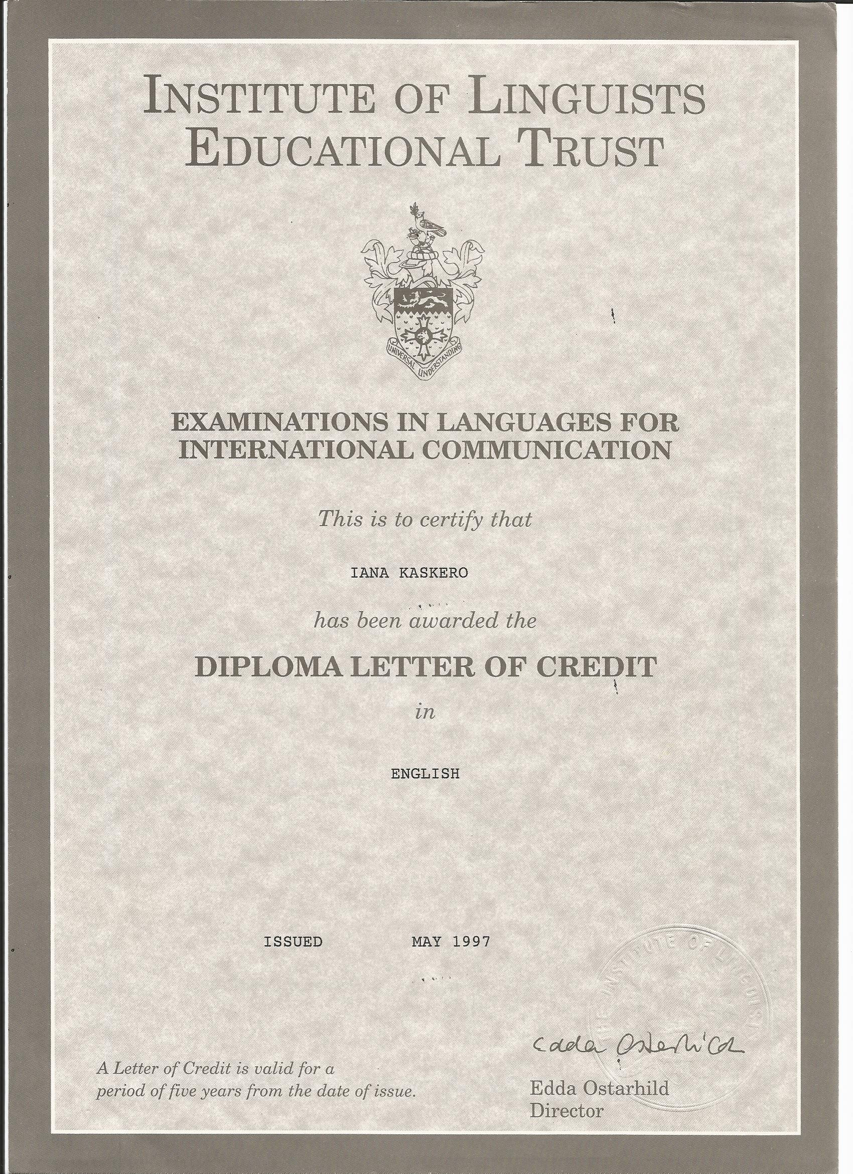 Обучение на Диплом по ” Английскому языку для международного общения” в Лондонском институте лингвистов, дало мне возможность глубоко ознакомиться аспектами как устной так и письменной Английской речи.