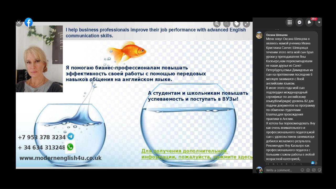 Я прожила в Великобритании более 24 лет и владению английским языком на профессиональном уровне. Сейчас я живу на Коста Дэл Сол, в Испании, где продолжаю преподавать английски через Skype и другие онлайн платформы.