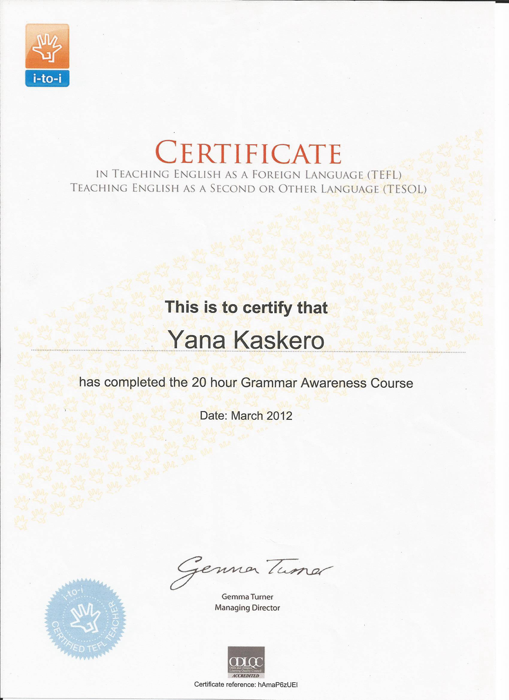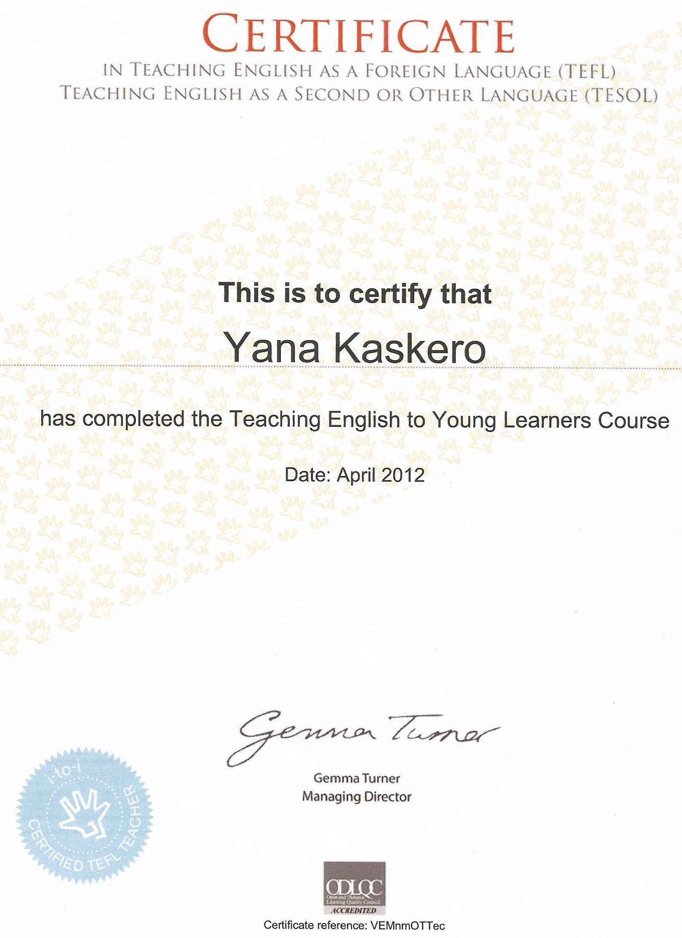 Здравствуйте, меня зовут Яна Каскеро, я частный TEFL преподаватель. Я закончила сертификационные курсы для преподавателей английского как иностранного (TEFL), что позволило мне расширить мои знания о теории и общих методиках преподавания английского как иностранного.